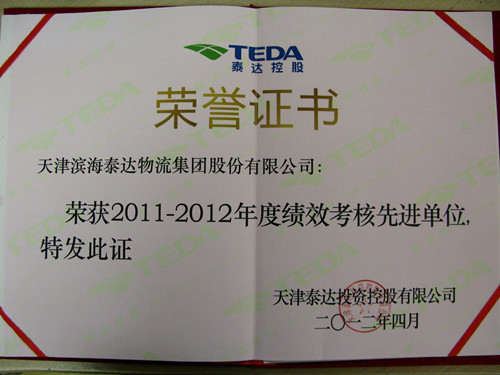 2012年4月26日,泰达控股公司对2011——2012年度绩效考核工作中取得突出成绩的单位进行了表彰,我集团等多家单位被授予“泰达控股2011——2012年度绩效考核先进单位”荣誉称号。