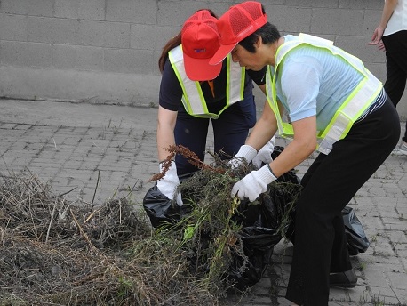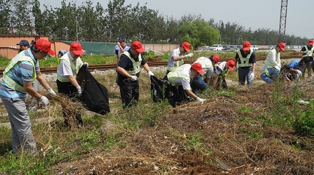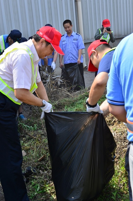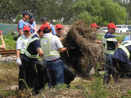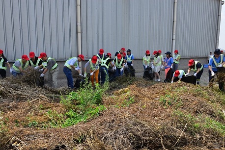 参加活动的集团领导和员工共同参与拔草除草活动。